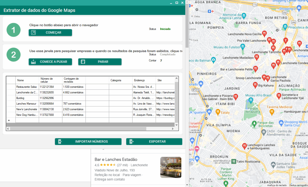 Em poucos cliques você define o tipo de estabelecimento e localização, e o sistema já começa a varrer todos, tudo de forma automática e salve em uma lista pronta para ser usada ou filtrada.